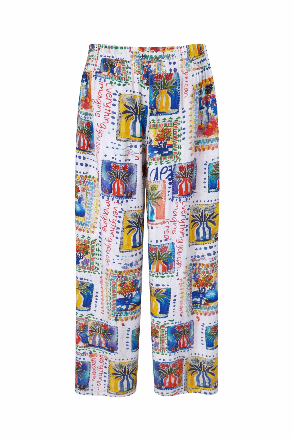 Luftige, weit geschnittene Hose mit elastischem Bund und Bindeband. Der farbenfrohe Print mit sommerlichen Motiven macht sie zum perfekten Hingucker für entspannte Urlaubs- und Freizeitlooks.