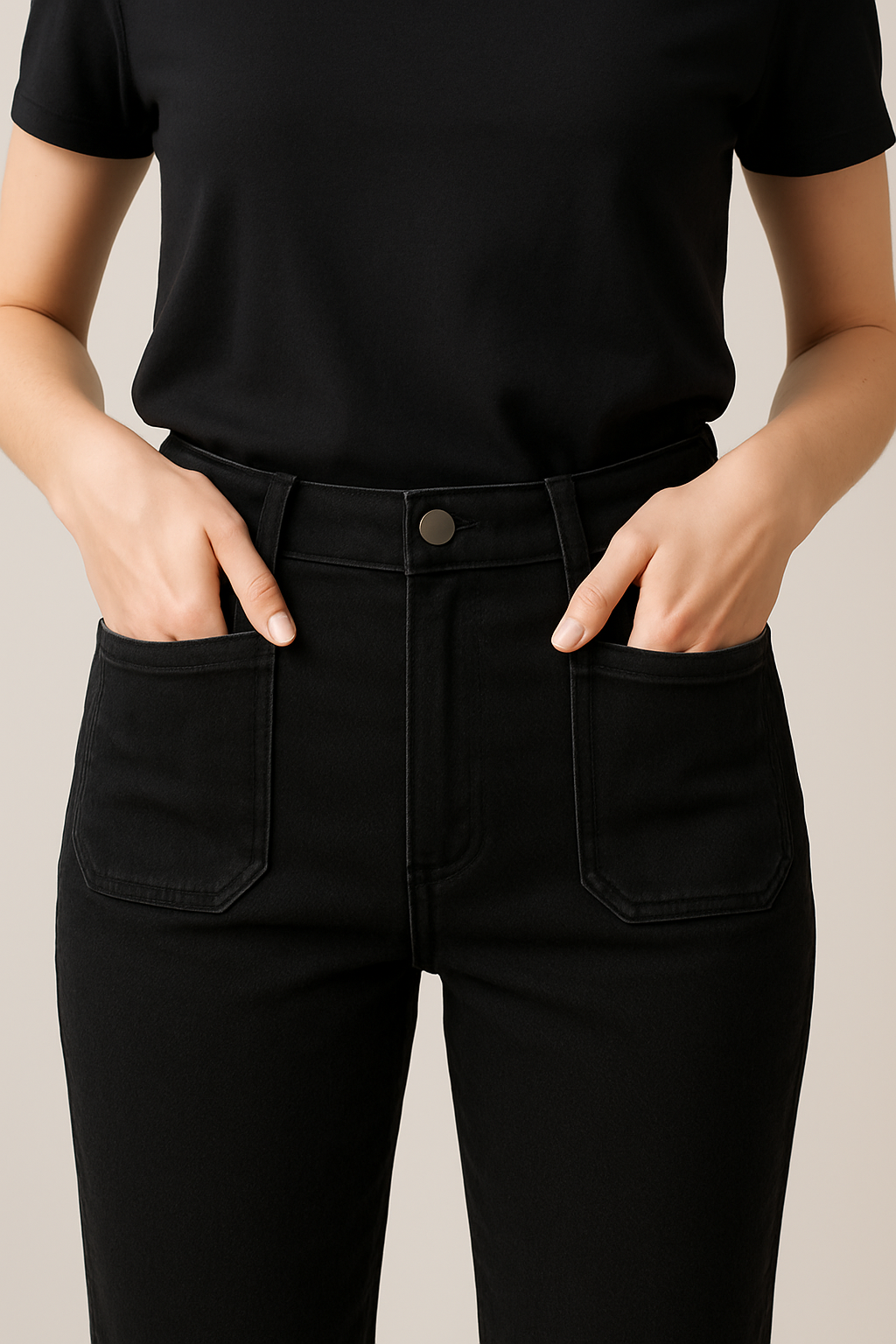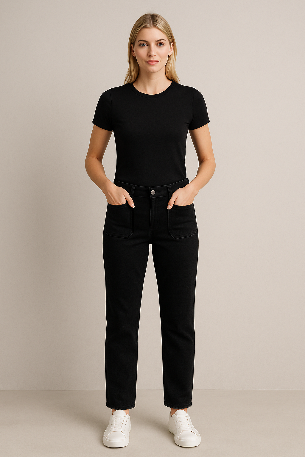 Diese schwarze Jeans überzeugt mit einem modernen, cleanen Look und hochwertiger Verarbeitung. Der gerade Schnitt sorgt für eine zeitlose Silhouette, während die aufgesetzten Front-Taschen dem Design einen trendigen, lässigen Twist verleihen. Durch den komfortablen Stretch-Denim trägt sich die Hose den ganzen Tag bequem und bleibt trotzdem formstabil.