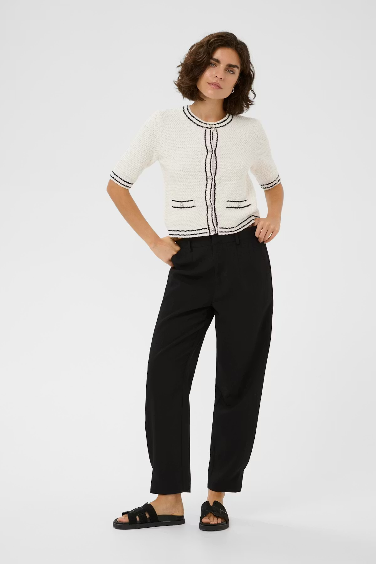 Schmal geschnittene Hose mit locker zulaufendem Bein, Bundfalten und strukturiertem Bund. Gürtelschlaufen für ein klassisches Erscheinungsbild.