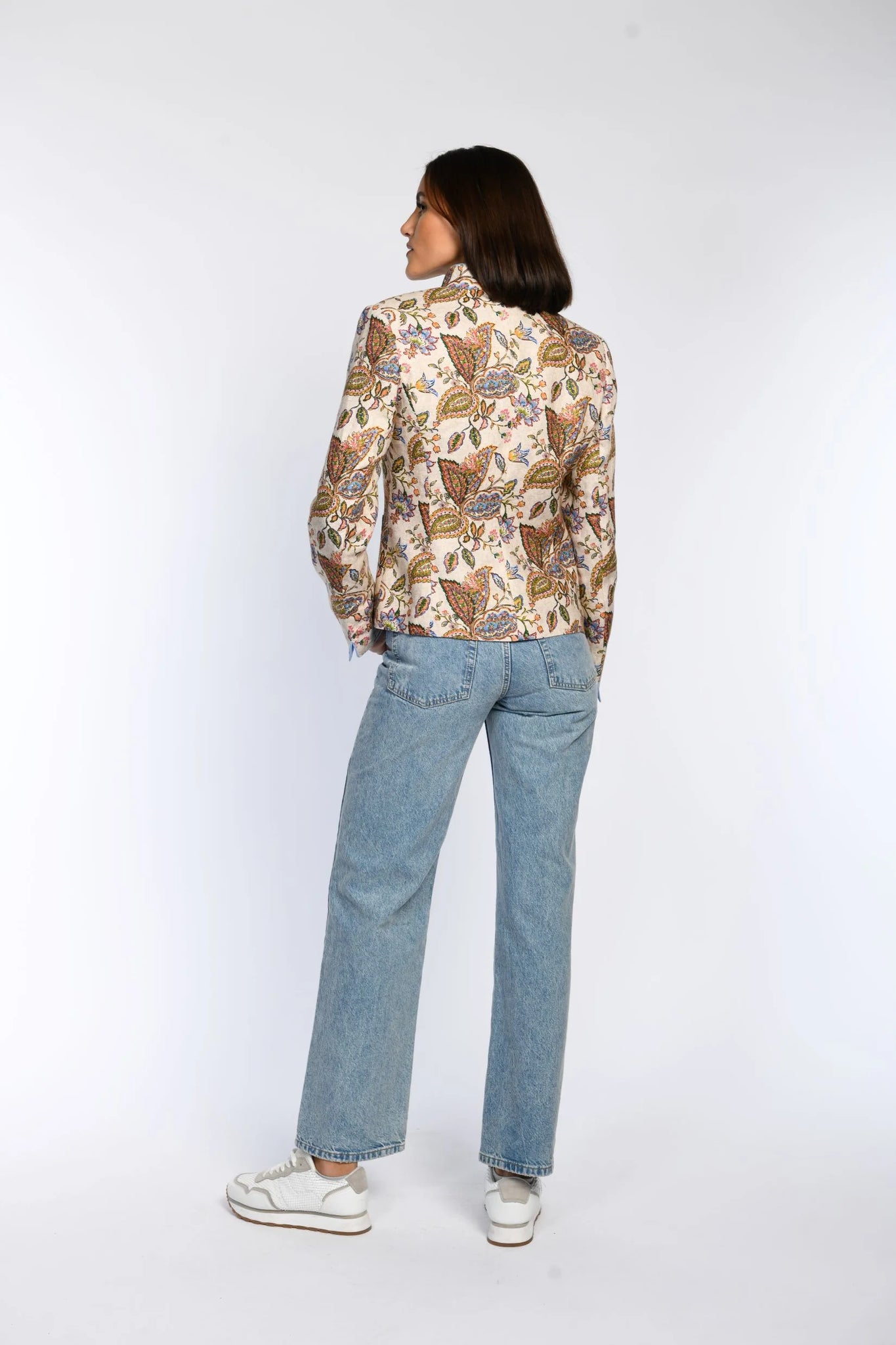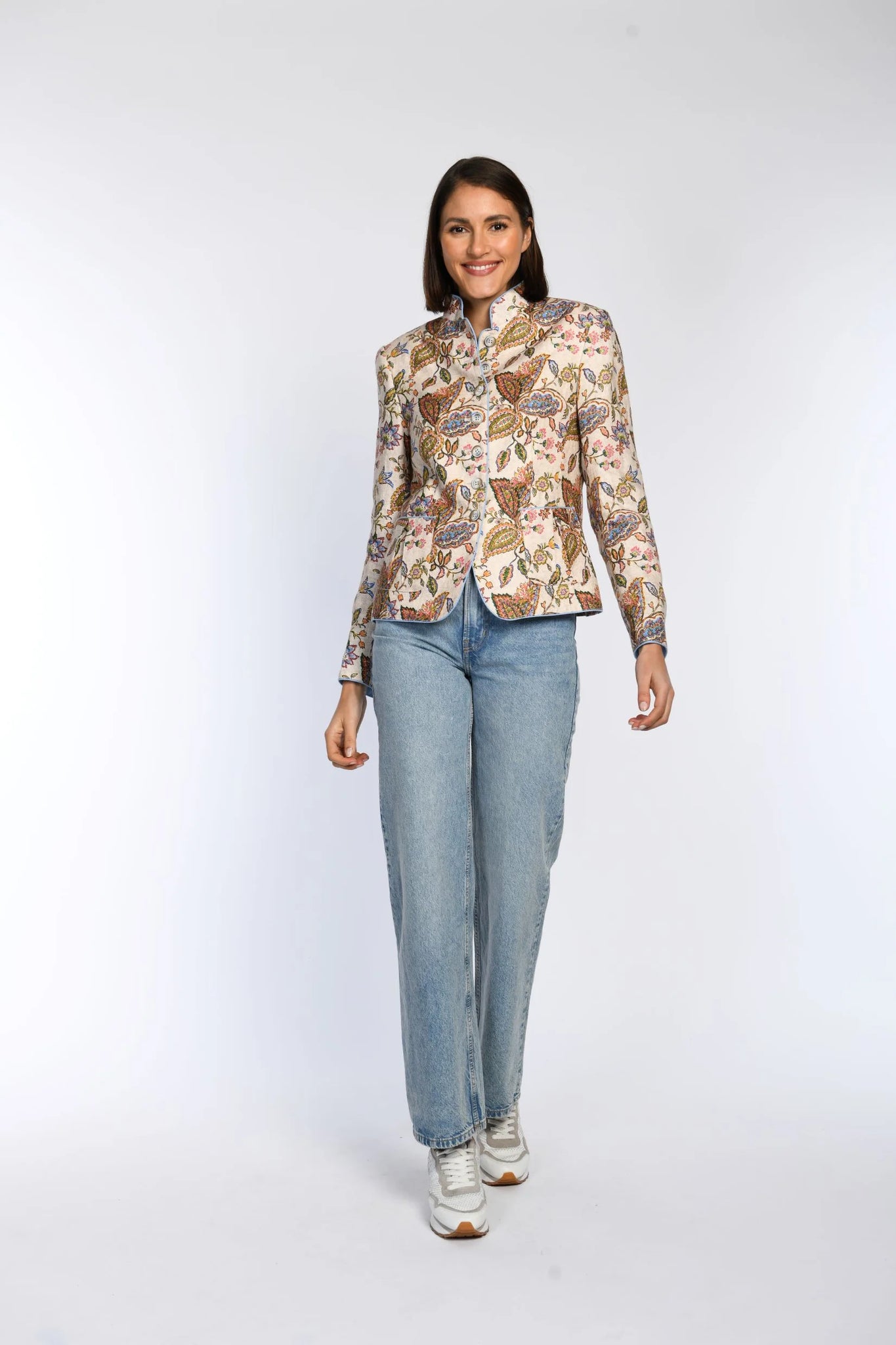 Der edle Druck und liebevolle Details verleihen diesem Leinenjanker frische Eleganz und eine moderne Ausstrahlung.