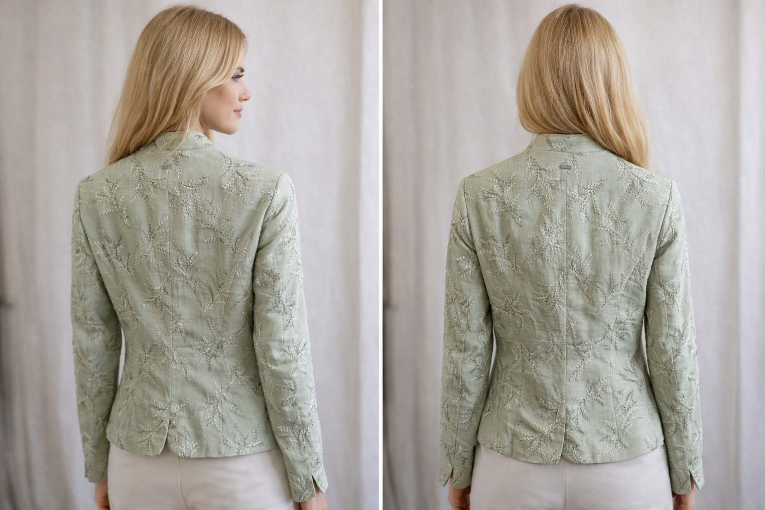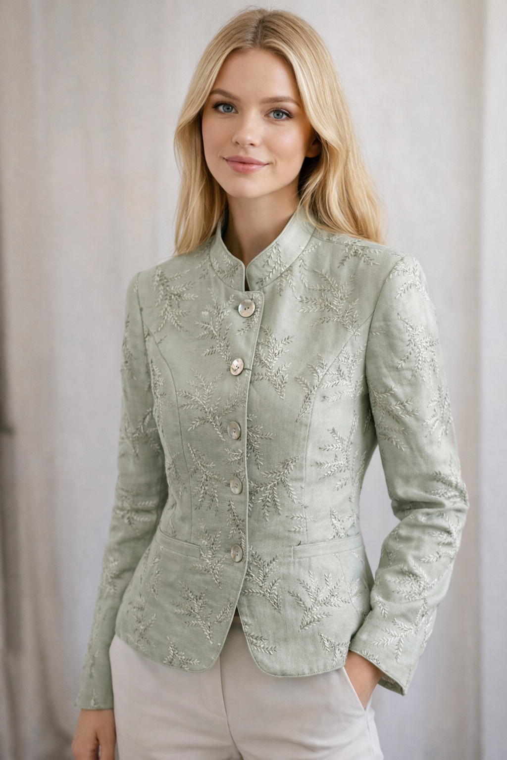 Die edle Stickerei und die hochwertige Leinenstruktur verleihen diesem Leinenjanker eine feminine Eleganz und eine moderne, stilvolle Ausstrahlung. Die taillierte Form unterstreicht die Silhouette und macht ihn zu einem besonderen Begleiter für viele Anlässe.
